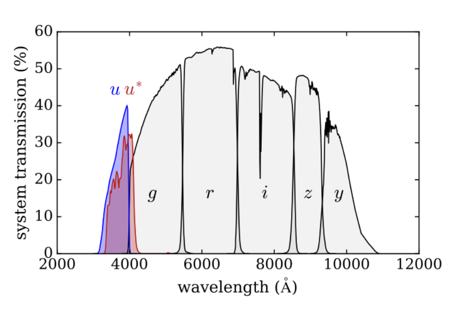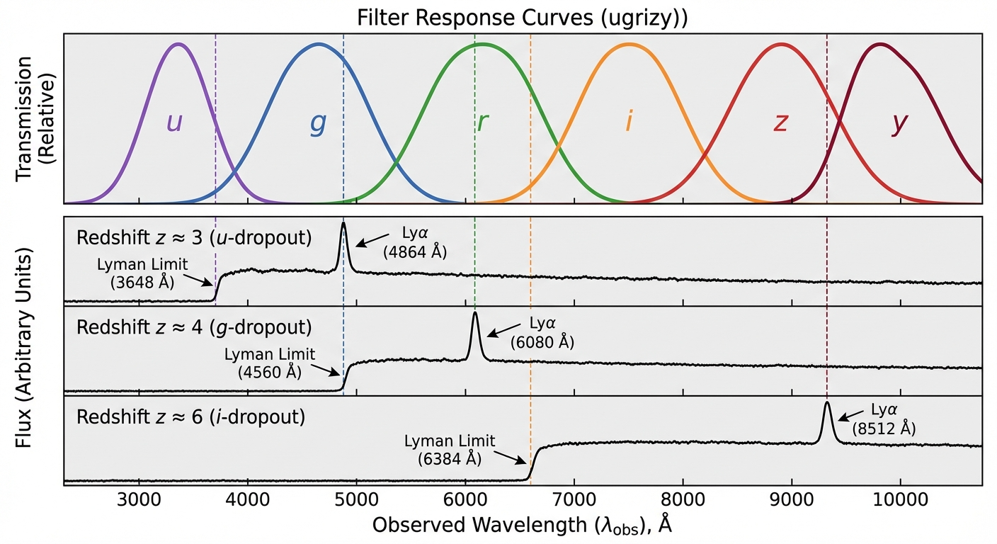 With redshifts $> 2$, the lyman limit will move to $u$-band, which can be observed by dropout method.
