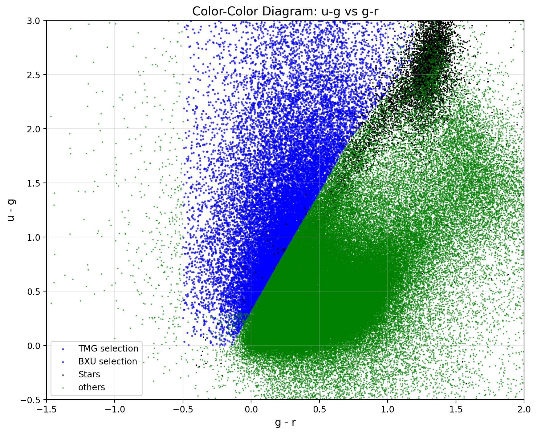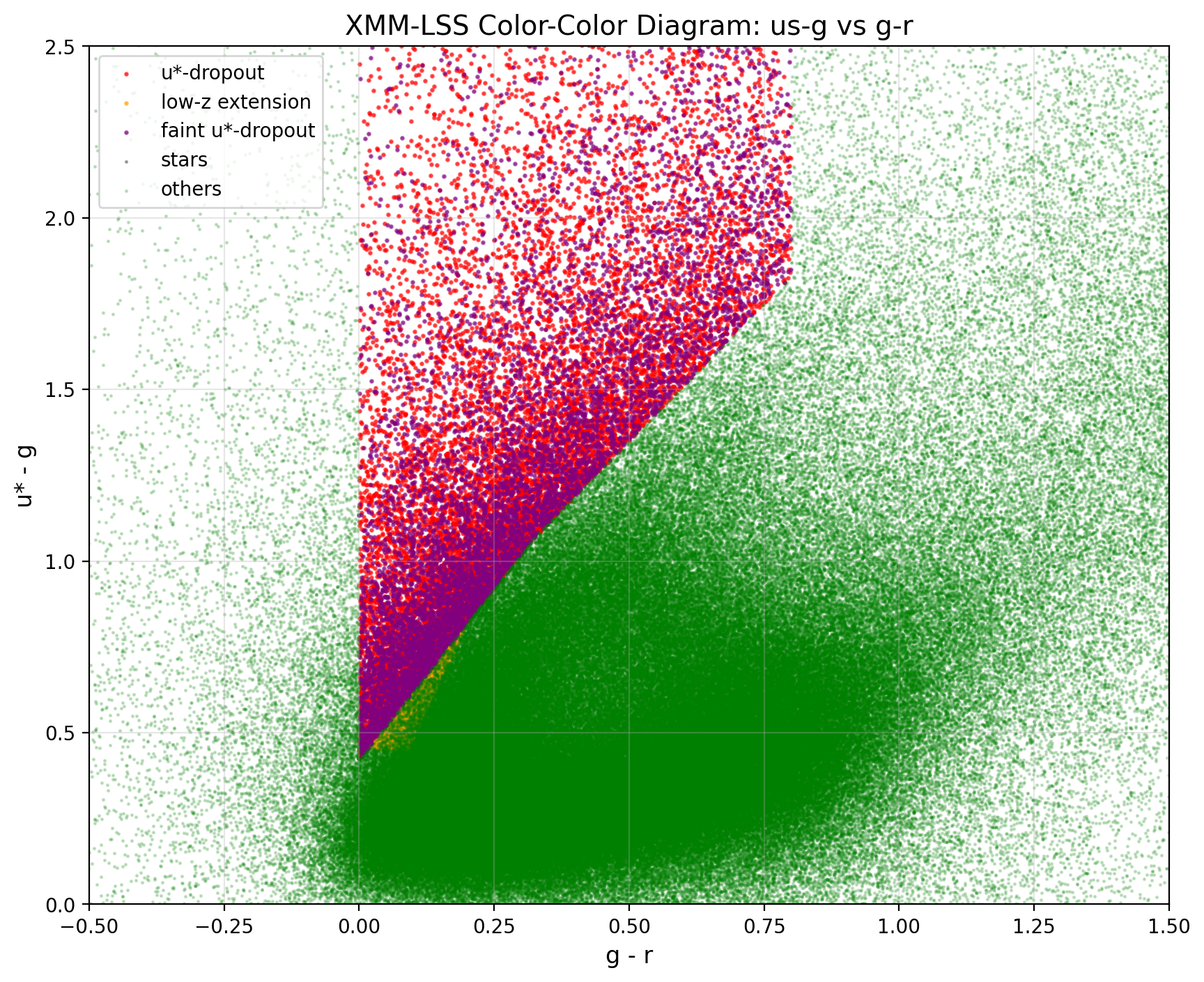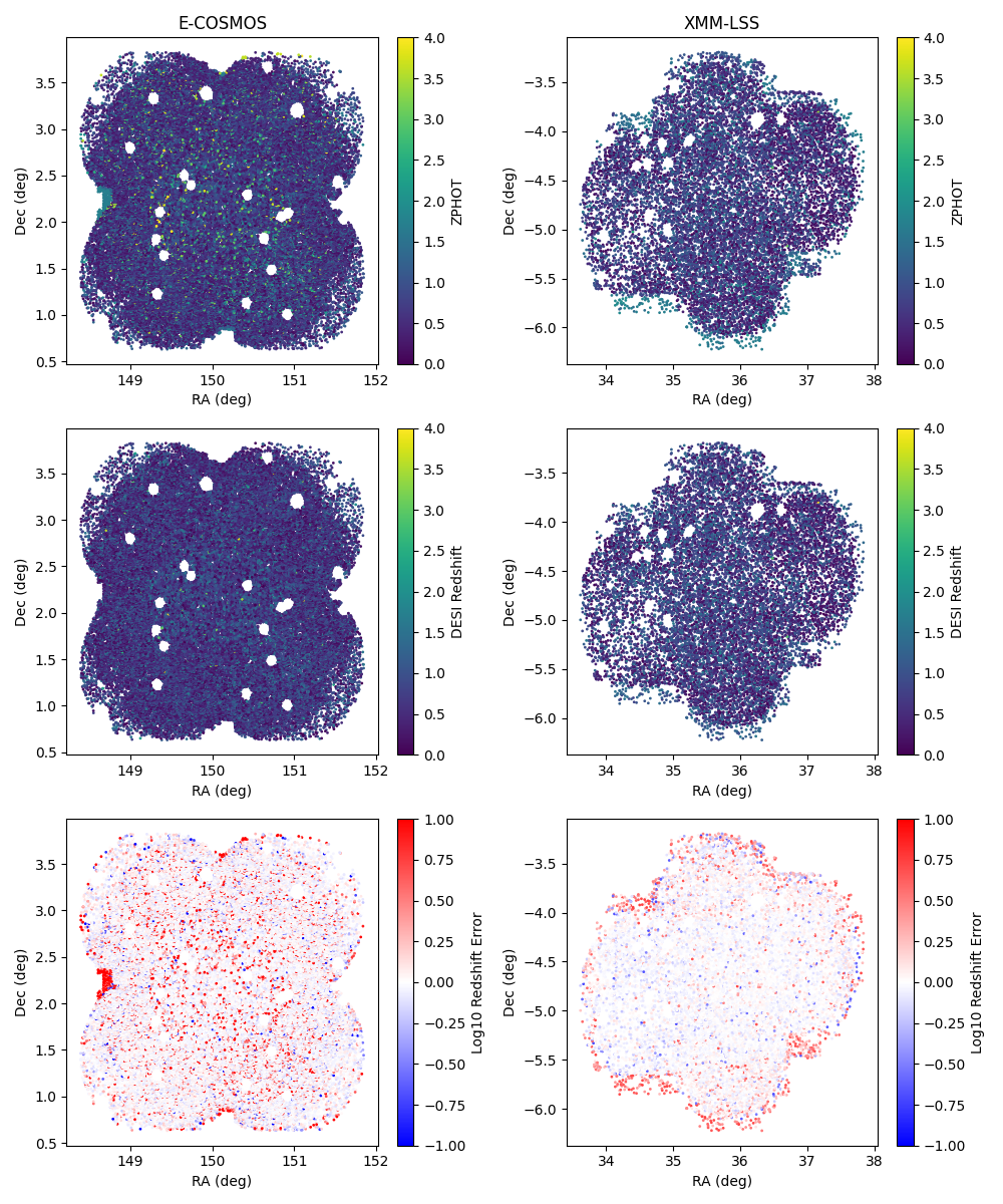 首先我们根据 CLAUDS 数据天区 RA,DEC 的边界,扩大 $0.5^{\circ}$ 下载 DESI 的 DR1 库中的编号、坐标、光谱红移、光谱形态、红移质量和形态特征. 为了使数据更有效,我们只选取了高质量红移、光谱特征非恒星 (spectype!='STAR')、形态特征非点源(morphtype!='PSF') 的数据.
